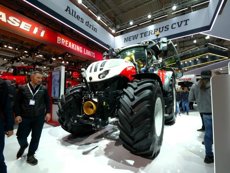 Het nieuwe topmodel uit de Steyr Terrus serie: de 6340 CVT. Ook een compacte 6-cilinder van 340 pk met een hydrauliekopbrengst van 220 liter per minuut, elf ton hefvermogen en een CVT naar 50km/h. De geveerde vooras en luxe cabine met leren bekleding en een actief geveerde stoel geven een exclusieve uitstraling. De Steyr is voorzien van de Isobus III en TIM protocol en heeft telematische connectie voor diagnose op afstand, wagenpark beheer en het optimaliseren van onderhoud.