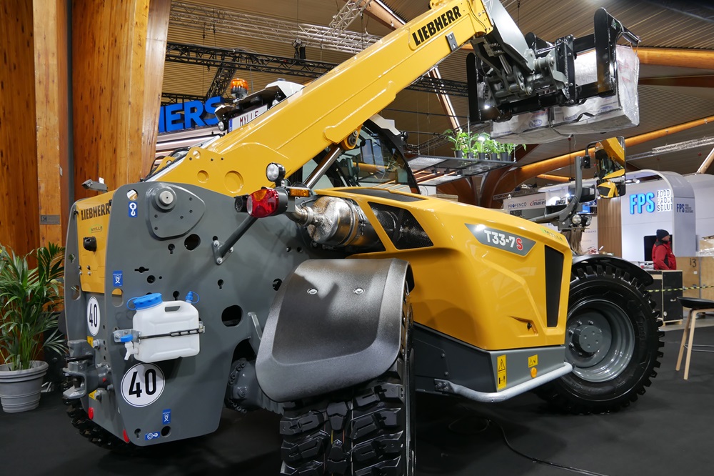 Op de Interpom was op de stand van Mylle H de Liebherr T33-7S telescooplader te bekijken. De getoonde machine beschikt over drie stuurmodi: voorwielbesturing, vierwielbesturing en krabbesturing. Dit komt de wendbaarheid in krappe ruimtes ten goede.