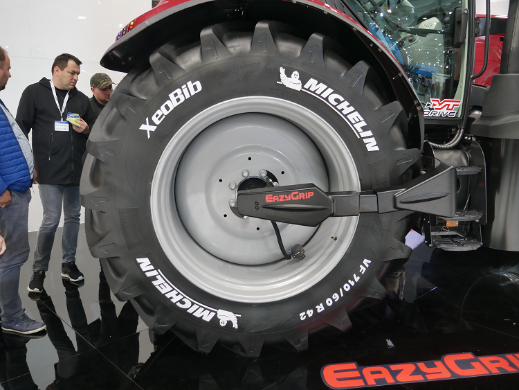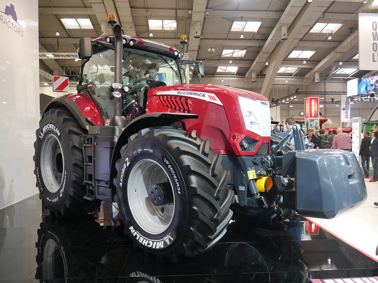 Het topmodel van McCormick X8.631 VT van 310 pk. Alles is een maatje groter, zo ook de branstoftank die 200 liter meer inhoud heeft. Een plaatje op de beursvloer zoals hij erbij staat op de Axiobib 2 van Michelin.