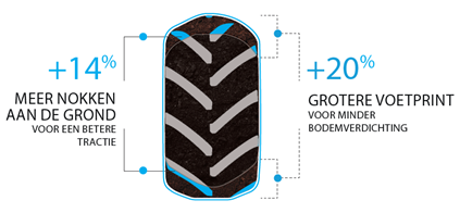 • Minder bodemverdichting dankzij een 20 %** groter contactvlak met de grond (voetafdruk).