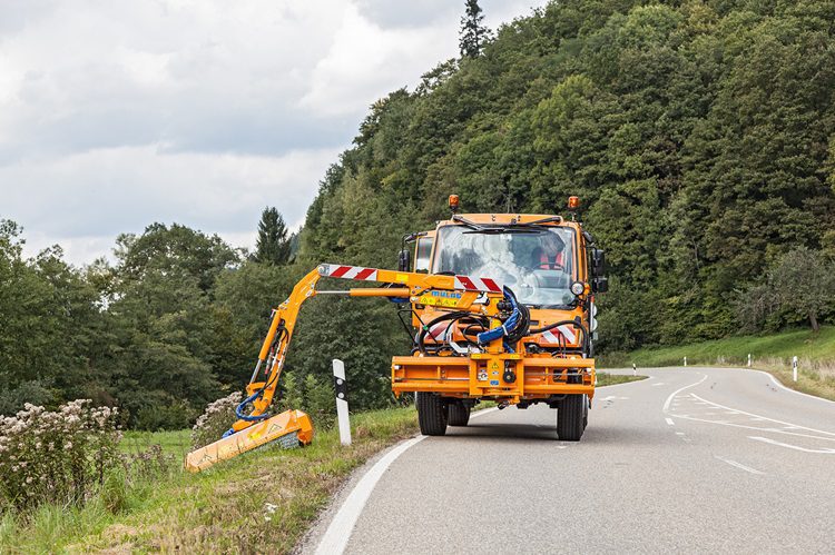 De Unimog is uitermate geschikt voor het onderhouden van bermen.