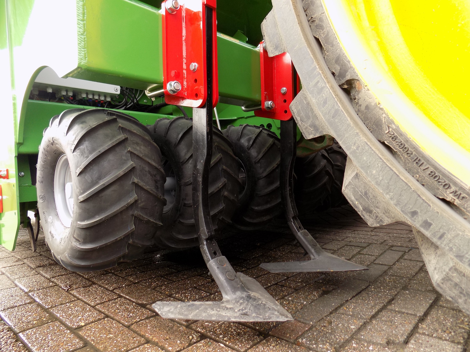 Naast het zo laag mogelijk houden van het gewicht is er bij de freespootcombinatie ook erg gelet op de juist gewichtsverdeling. Allereerst door de omgekeerde bunker, maar ook door 3×3 wielen vooraan de machine te plaatsen: “Negen wielen die het gewicht van de machine over de volle breedte (3 meter) verdelen. Hij loopt ook voornamelijk op de wielen en de aanaardkap. Dat is vergelijkbaar met de manier waarop een rijenfrees druk geeft op een aanaardkap; dus druk op een goede manier.”
