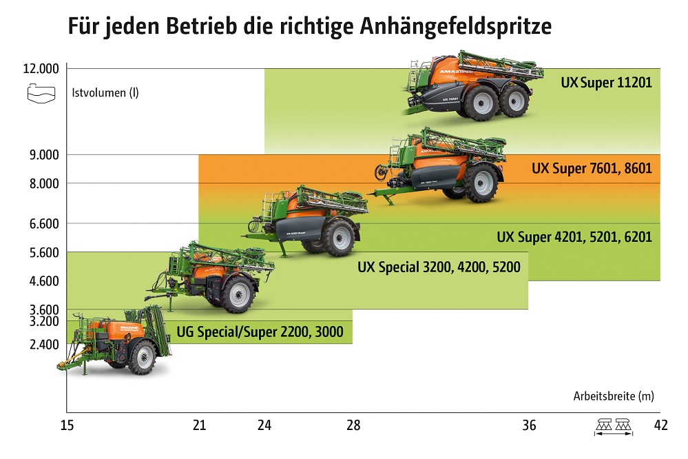 AMAZONE breidt de familie UX getrokken veldspuiten uit met de krachtige typen UX 7601 Super met 8.000 l en UX 8601 Super met 9.000 l werkelijke inhoud. Dankzij de consequente voortzetting van het compacte AMAZONE-machineontwerp combineren de nieuwe modellen een tankinhoud tot 9.000 l en een spuitboombreedte tot 42 m met de goede wendbaarheid en hoge stabiliteit van een enkelassige veldspuit.