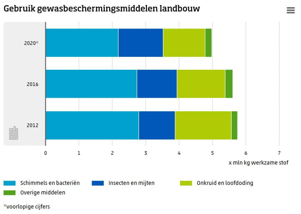 In 2020 werd bijna 2,2 miljoen kilogram gewasbeschermingsmiddelen (uitgedrukt in werkzame stof) ingezet voor de bestrijding van schimmels en bacteriën. Dat is bijna 20 procent minder dan in 2016, maar met bijna 44 procent van het totaal blijft dit de meest gebruikte groep van gewasbeschermingsmiddelen. Voor onkruidbestrijding en loofdoding is ruim 1,2 miljoen kilogram werkzame stof gebruikt, 14 procent minder dan in 2016. Het gebruik van middelen ter bestrijding van insecten en mijten steeg met bijna 12 procent tot ruim 1,3 miljoen kilogram in 2020. Het gebruik van overige middelen, onder meer voor slakkenbestrijding, plantengroeiregulatie en kiemremming, nam met 10 procent af ten opzichte van 2016, tot 0,2 miljoen kilogram. Bij dit soort veranderingen speelt het weer tijdens de teelt een grote rol.