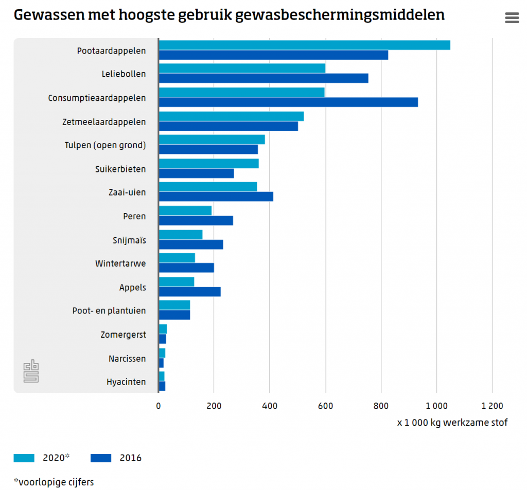 Bij twee derde van de 42 onderzochte landbouwgewassen werden in 2020 minder gewasbeschermingsmiddelen gebruikt dan in 2016. Zo werd voor de teelt van leliebollen 601 duizend kilogram gebruikt, tegen 755 duizend kilogram in 2016 (daling van bijna 21 procent). Daarentegen werd bijna 1,1 miljoen kilogram gebruikt in de pootaardappelenteelt, 27 procent meer dan in 2016. In totaal werd 2,2 miljoen kilogram gebruikt voor de bescherming van consumptie-, poot- en zetmeelaardappelen. Dat is bijna 44 procent van alle gewasbeschermingsmiddelen die in 2020 in de landbouw zijn gebruikt.