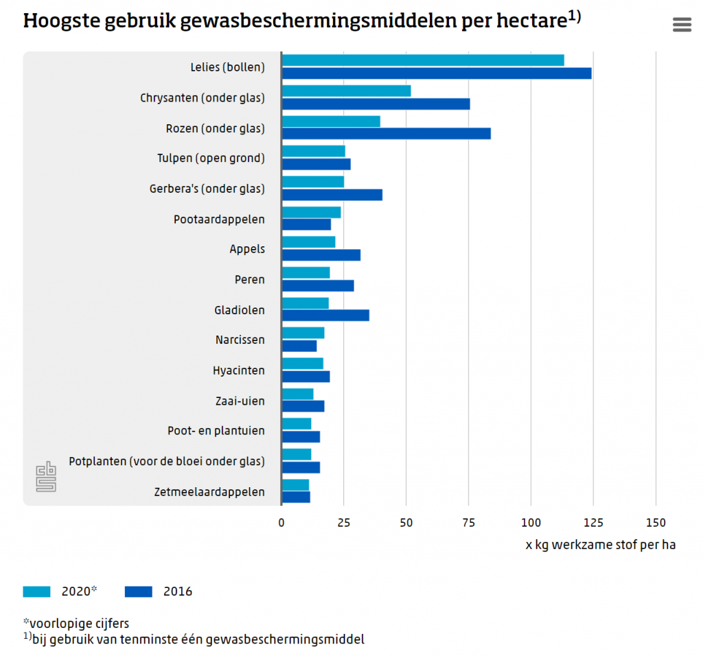 Leliebollen zijn het meest middelenintensieve landbouwgewas: in 2020 werd per hectare met gewasbescherming 114 kilogram aan gewasbeschermingsmiddelen gebruikt; waarvan 83 kilogram paraffine-olie. Dit is een lichte afname ten opzichte van 2016 (125 kilogram per hectare). Bij chrysanten en rozen, geteeld onder glas, werd respectievelijk 52 en 40 kilogram per hectare ingezet. Tulpen en gerbera’s maken de top vijf gewassen met het hoogste gebruik per hectare met gewasbescherming compleet.