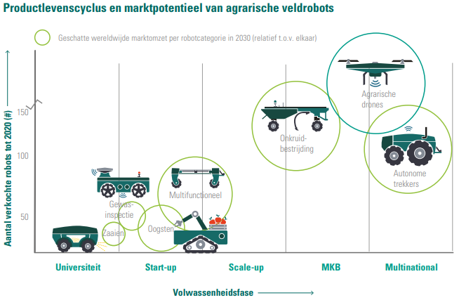 De tabel geeft de verschillende fases van volwassenheid weer van de zeven categorieën veldrobots en drones. De groene cirkel is de geschatte, relatieve marktomvang per categorie wereldwijd in 2030. Die hebben we ingeschat met behulp van mondiale verkoopcijfers, beurspresentaties, jaarrapporten, vakliteratuur en interviews.