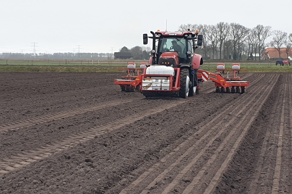 De elektrisch aangedreven Kramer Proseeder bij akkerbouw- en loonbedrijf Sandee uit Onstwedde is een echte capaciteitsmachine. “Ik denk dat niemand zoveel zaadjes weglegt, als wij dat doen”, vertelt zaaier Frank Vegter. De zaaimachine legt vijf rijen op drie bedden van 1,50 meter. Het unieke is de variabele afgifte per rij.