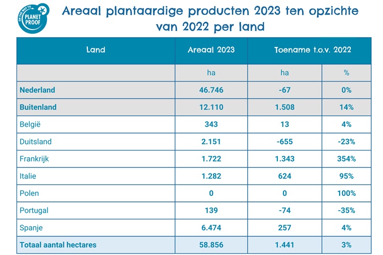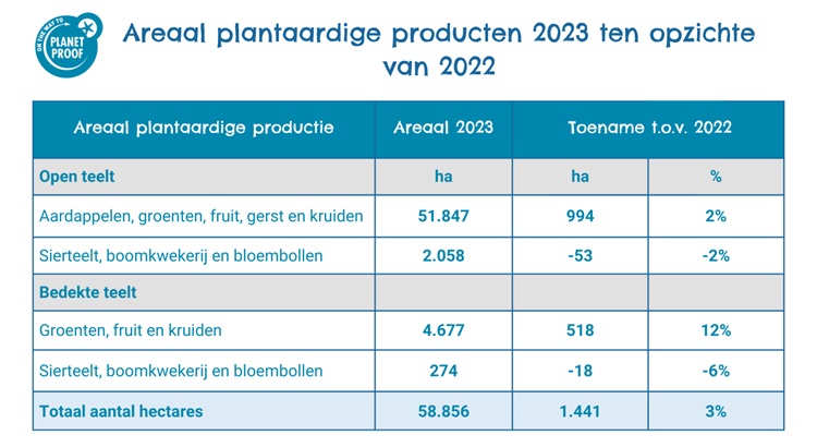 Het aantal telers van plantaardige producten met het topkeurmerk On the way to PlanetProof is in 2023 stabiel gebleven. Wel steeg het areaal van de keurmerkhouders met drie procent naar 58.856 hectare. Sterke groei was er in vollegrondsgroenten met twaalf procent.