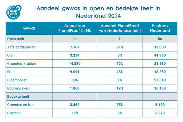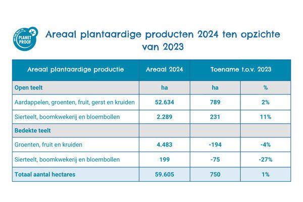 Het keurmerk On the way to PlanetProof blijft zich ontwikkelen. Het gecertificeerde areaal voor de plantaardige productie steeg met 1,3 procent. Vooral de open teelt laat groei zien, zoals aardappelen, groenten, fruit (+2%) en sierteelt (+11%). Hoewel het gecertificeerde areaal is toegenomen, is het aantal keurmerkhouders licht gedaald (-4%).