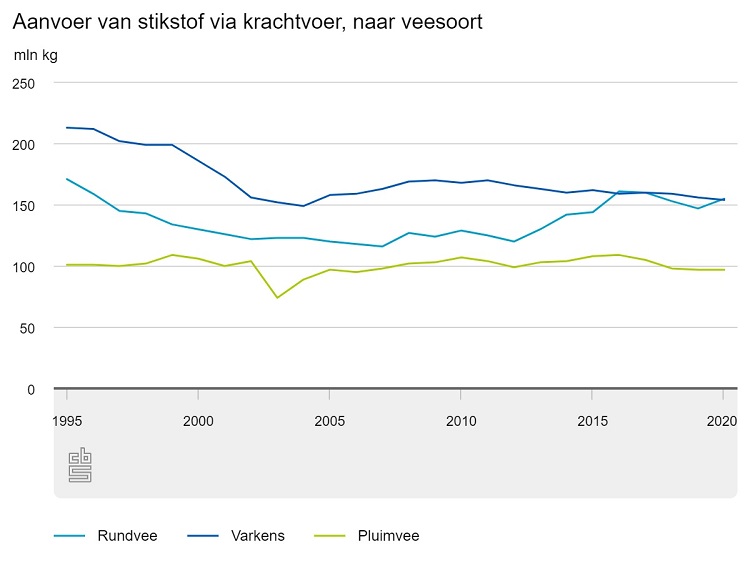 Dat er na 2012 meer stikstof via dierlijke mest op landbouwgrond terecht is gekomen komt doordat koeien meer krachtvoer zijn gaan eten. In Nederland eten koeien vooral gras en snijmais van Nederlandse bodem, aangevuld met krachtvoer. Varkens en pluimvee eten hoofdzakelijk krachtvoer. Krachtvoer wordt gemaakt van bijvoorbeeld tarwe, korrelmais en soja en is een belangrijke bron van eiwit in de voeding van vee. Stikstof is een bouwsteen van eiwit; daarom spreken we van ‘de aanvoer van stikstof via krachtvoer’. Tot ongeveer 2002 daalde de aanvoer van stikstof via krachtvoer naar varkens en runderen. Daarna steeg de aanvoer weer, maar waar de stijging bij varkens stagneerde, nam deze bij runderen na 2012 sterk toe.