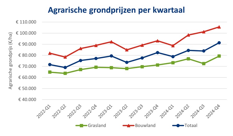 De gemiddelde agrarische grondprijs in Nederland is in het 4e kwartaal van 2024 met 8,8 procent gestegen vergeleken met het 3e kwartaal. Van 83.900 euro naar 91.300 euro per hectare. Over heel 2024 is de grondprijs uitgekomen op 85.300 euro per hectare, dat is 8,3 procent hoger dan in 2023.