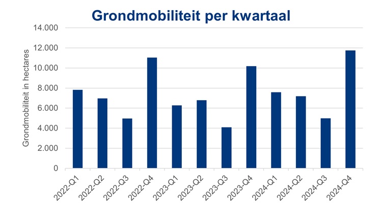De relatieve grondmobiliteit bestaat uit het verhandeld areaal afgezet tegen het totaal areaal landbouwgrond. Dit kwam in 2024 uit op 1,75 procent, tegen 1,53 procent in dezelfde periode het jaar daarvoor.