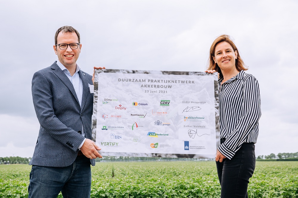 André Hoogendijk van BO Akkerbouw en Esther Veldhuis van het ministerie van Landbouw, Natuur & Voedselkwaliteit hebben woensdag 23 juni 2021 een intentieverklaring ondertekend voor de start van het Duurzaam Praktijknetwerk Akkerbouw. Dit netwerk verbindt akkerbouwers in hun zoektocht naar steeds duurzamere teeltmethoden.