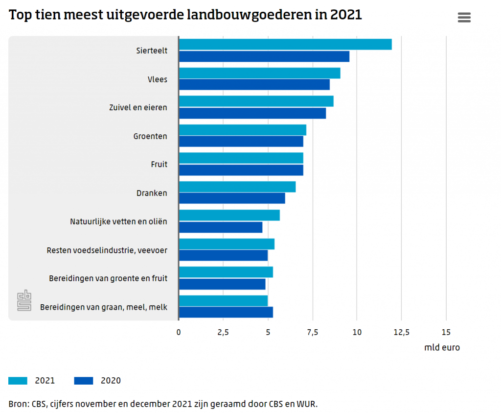 Net als in eerdere jaren is sierteelt (bloemen, planten, bloembollen en boomkwekerijproducten) in euro’s gemeten het belangrijkste landbouwexportproduct. In 2021 werd voor 12 miljard euro aan sierteeltproducten uitgevoerd, een kwart meer dan in 2020. Deze toename komt vooral door de sterk gestegen prijzen van bloemen en planten in 2021. In 2020 exporteerde Nederland voor 9,6 miljard euro aan sierteelt en in 2019 voor 9,5 miljard euro.