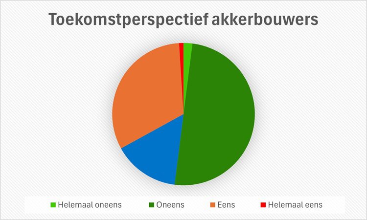 Dit onderzoek naar het toekomstperspectief van akkerbouwers in Nederland is uitgevoerd door Prosu. Dit is het data- en mediabedrijf waar de Akkerbouwkrant onder valt. Tussen december 2024 en juli 2025 belde het callcenter van Prosu met 936 telers. De ondervraagden kregen onder andere de stelling voorgelegd ‘Ik maak me zorgen over de toekomst van mijn bedrijf’. 1 procent van de telers is het volledig eens met deze stelling, 32 procent antwoordde ‘mee eens’. Vijftien procent kijkt neutraal naar deze stelling. Vijftig procent van de telers is het niet met de stelling eens, dus ziet de toekomst van zijn bedrijf optimistisch tegemoet. Twee procent van de telers antwoordde zelfs ‘helemaal mee oneens’.