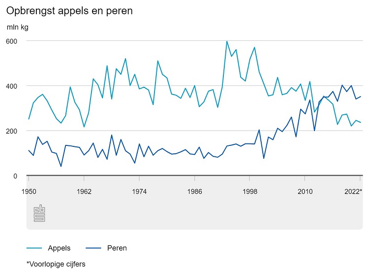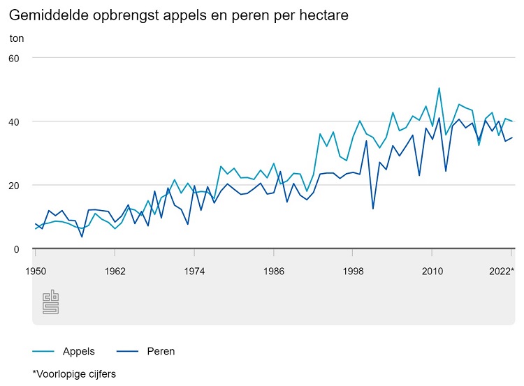 In 2022 was de opbrengst van appels zes procent lager dan in 1950, terwijl de perenopbrengst in dezelfde periode ruim verdrievoudigde. Dit blijkt uit het nieuwe landbouwdashboard van het CBS.
