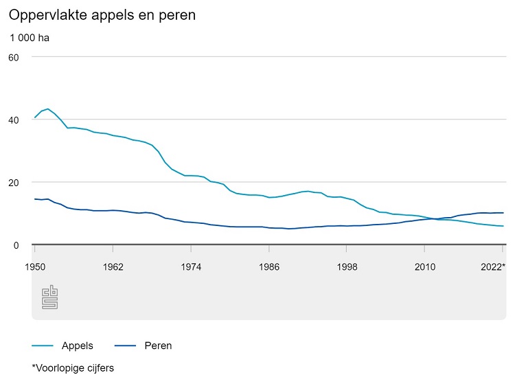 De oppervlakte (areaal) in gebruik voor de teelt van appels is sinds 1950 met 85 procent afgenomen. Bij peren nam het areaal van 1950 tot 2022 met een derde af. Lange tijd was het areaal appels groter dan peren, maar dat is sinds 2012 omgekeerd.