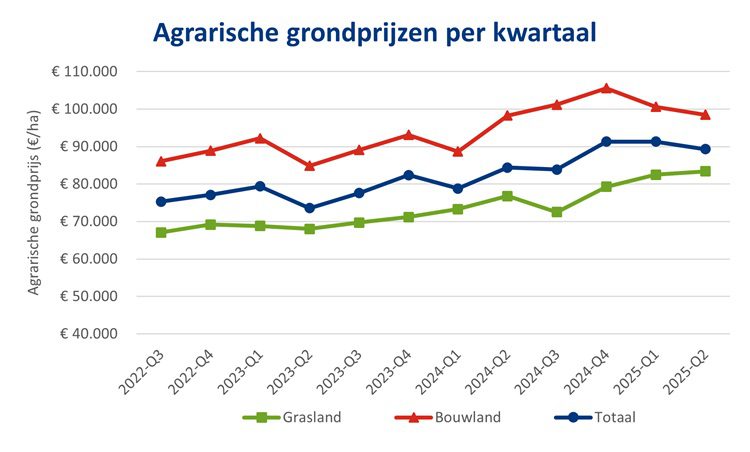 De gemiddelde agrarische grondprijs in Nederland is in het tweede kwartaal van 2025 uitgekomen op 89.300 euro per hectare. Dat is een daling van 2,2 procent ten opzichte van de prijs in het eerste kwartaal van 2025 (€ 91.300), en een stijging van 4,7 procent ten opzichte van de gemiddelde grondprijs over heel 2024 (€ 85.300 per ha).