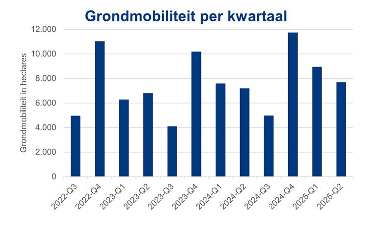 In het tweede kwartaal van 2025 is 7.700 hectare landbouwgrond verhandeld, bijna 500 hectare (7 procent) meer dan in hetzelfde kwartaal van 2024. Gemeten over de laatste vier kwartalen is in totaal 33.400 hectare grond in andere handen overgegaan. Dat is 4.300 hectare (15 procent) meer dan in dezelfde periode een jaar eerder.