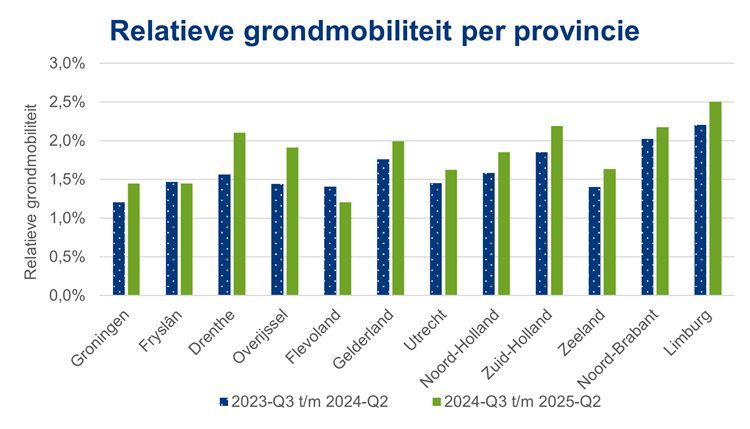 De relatieve grondmobiliteit varieert over de vier laatste kwartalen van 1,21 procent in Flevoland tot 2,50 procent in Limburg. In vergelijking met een jaar eerder is de relatieve grondmobiliteit in 10 van de 12 provincies gestegen, met de grootste stijging in Drenthe en Overijssel (beide 0,5 procentpunt). In Flevoland daalde de mobiliteit met 0,20 procentpunt en in Fryslân met 0,02 procentpunt.