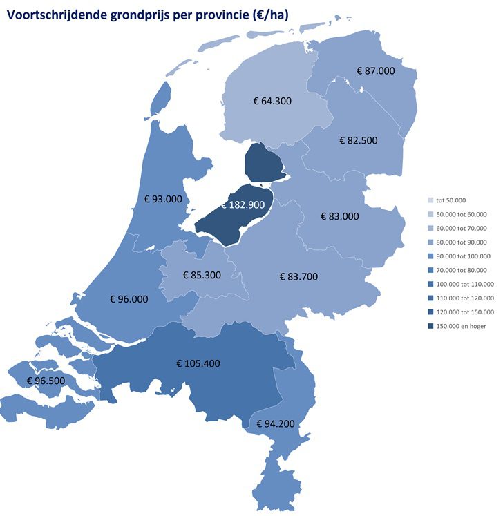 De gemiddelde agrarische grondprijs in Limburg en Noord-Brabant is met achtereenvolgens vier en drie procent gestegen, terwijl die in Zeeland ongeveer gelijk is gebleven.