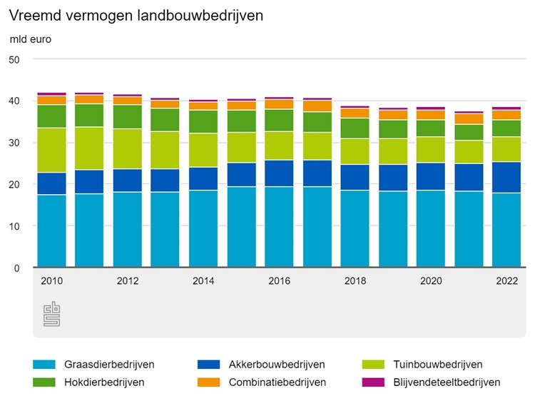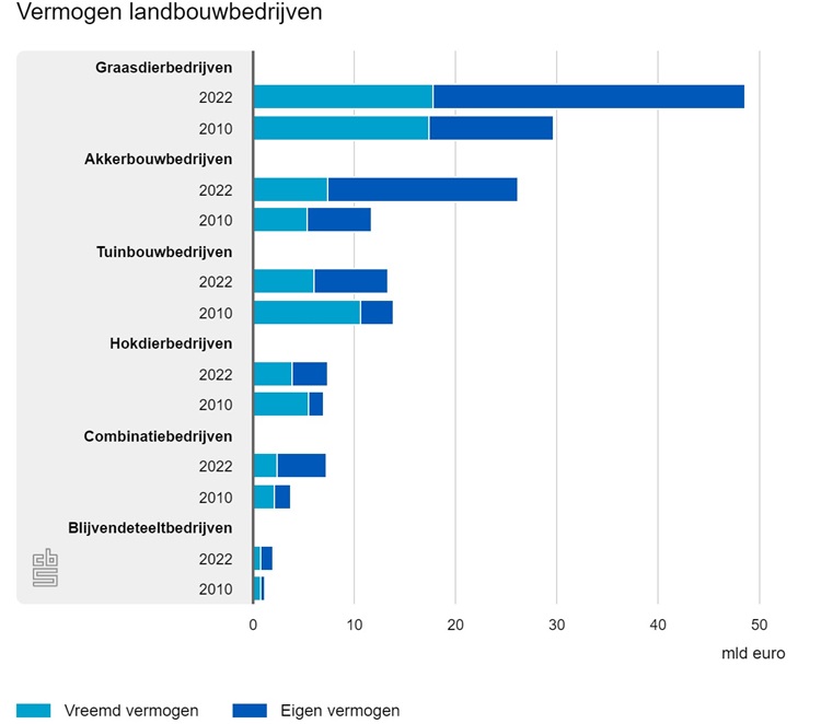 Het vreemd vermogen van landbouwbedrijven is gedaald van 42,0 miljard euro in 2010 naar 38,6 miljard euro in 2022, een afname van acht procent. Ondertussen steeg het eigen vermogen naar 66,4 miljard euro, bijna drie keer zoveel als in 2010.