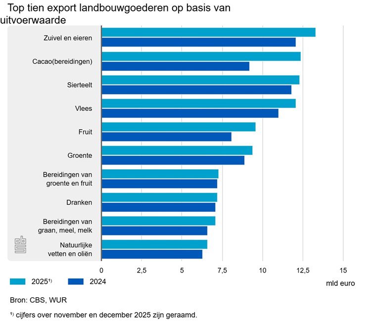 De exportwaarde van zuivel en eieren (13,3 miljard euro) en van vlees (12,1 miljard euro) is ten opzichte van 2024 met tien procent toegenomen. De export van sierteelt, zoals bloembollen, snijbloemen, planten en boomkwekerijproducten neemt met vier procent in waarde toe.