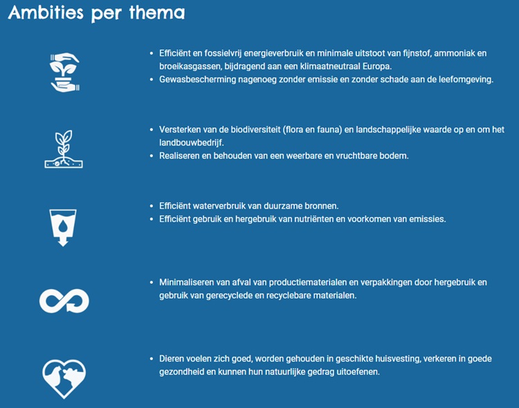 De ambitie van On the way to PlanetProof is om een productie te realiseren die in balans is met onze leefomgeving. Deze ambitie is verder uitgewerkt in ambities per thema, die te vinden zijn op de website. Als de ambitie voor alle thema’s bereikt is, kunnen we zeggen dat de productie ‘PlanetProof’ is. Tot die tijd werken we hier naartoe en zijn we ‘On the way…’