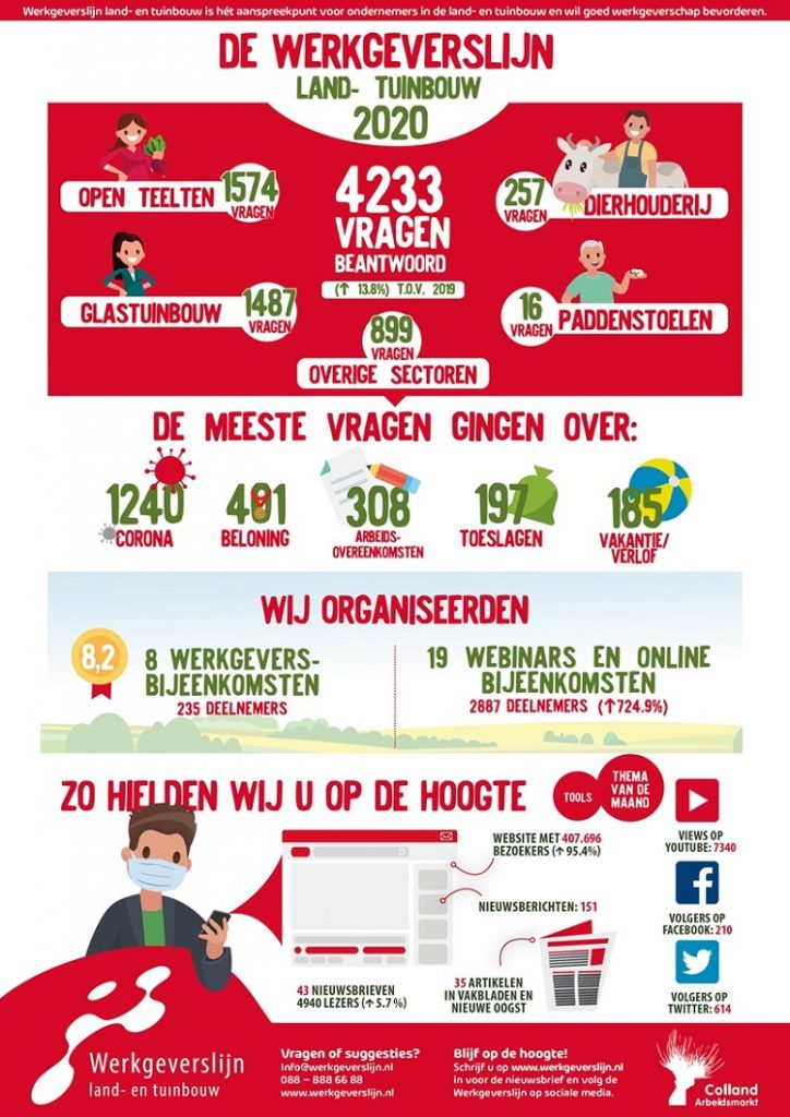 Op de infographic van de Werkgeverslijn is te zien over welke onderwerpen naast corona de meeste vragen gesteld zijn. Net als vorig jaar kwamen de meeste vragen vanuit de glastuinbouwsector en de open teelten. Afgelopen jaar is meer en meer duidelijk geworden dat de behoefte aan informatie en advies blijft groeien. Door een financiële bijdrage van Colland Arbeidsmarkt kan iedere agrarische werkgever gebruik maken van de ervaring en expertise van het team van de Werkgeverslijn. Eleveld: “Goed werkgeverschap is en blijft voor de Werkgeverslijn een speerpunt.”