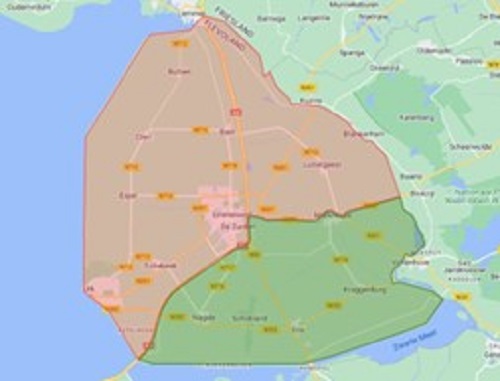Met ingang van 1 september breidt Weevers BV, die vestigingen heeft in Zeewolde en Swifterbant, zijn werkgebied uit naar het Noordelijk gedeelte van de Noordoostpolder. Het rood gearceerde gedeelte in onderstaande afbeelding. Van der Sluis Agri uit Ens gaat per 1 september ook het merk Einböck voeren in het Zuidelijk deel van de Noordoostpolder. Zij hebben de merken Kuhn en Rauch al in hun portefeuille. Dit is het groen gearceerde gedeelte op de onderstaande afbeelding.