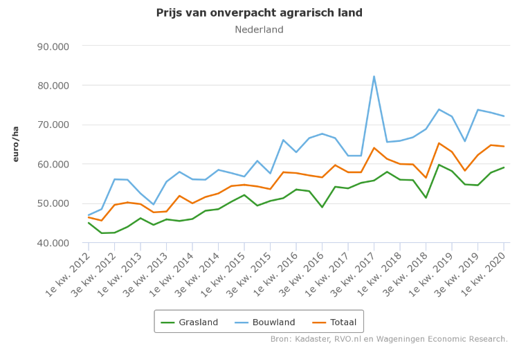 De gemiddelde agrarische grondprijs in Nederland is in het 1e kwartaal van 2020 uitgekomen op € 64.400 per ha. Dat is vrijwel gelijk aan de prijs in het 4e kwartaal van 2019, maar 4% hoger dan de gemiddelde prijs van € 61.900 per ha over heel 2019.