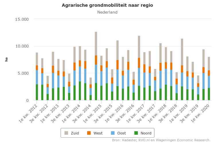 Gemeten over de laatste vier kwartalen (2019Q2 tot en met 2020Q1) is in totaal 29.300 ha grond in andere handen overgegaan, dat is 14% minder dan de 33.900 ha in dezelfde periode een jaar eerder (2018Q2-2019Q1). De relatieve grondmobiliteit – het verhandeld areaal afgezet tegen het totaal areaal landbouwgrond – over de vier laatste kwartalen bedraagt 1,7%, tegen 1,9% in dezelfde periode het jaar daarvoor.
