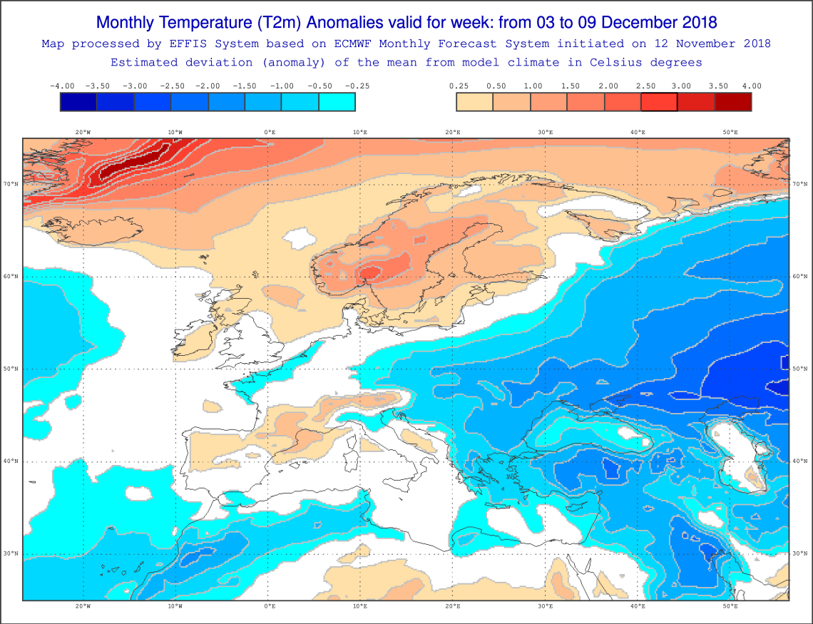 Dat is een lastige vraag. Want hoe blijft het hogedrukgebied zich manifesteren? Het Europees model heeft daar wel een mening over. Die laat het in de week van 3 t/m 9 december minder koud worden in West-Europa. Het model voorziet een vrij normale periode, niet te koud en niet te warm. Alleen in de kustgebieden kan het nog net iets te koud zijn. Ik hou toch wel een slag om de arm bij deze kaart. De kou lijkt weliswaar iets teruggedrongen te worden naar het oosten, maar het oogt allemaal wat gammel en ik sluit niet uit dat de kou ook in deze week nog aanhoudt.