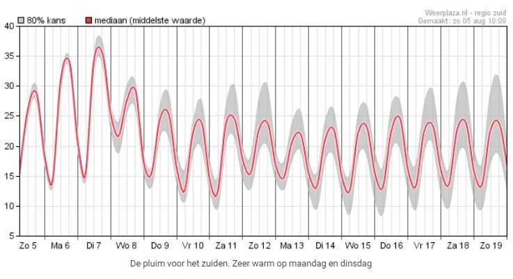 Zoals het er nu naar uit ziet wordt woensdag een overgangsdag, zo meldt WeerPlaza. Verspreid over het land kunnen een paar pittige buien vallen. Afhankelijk van waar de buien zullen vallen kan het landinwaarts nog tot 30 graden worden. De wind draait naar het westen of zuidwesten en daarmee wordt geleidelijk minder warme lucht aangevoerd. Dat merken we later in de week als de maxima tussen 20 en 25 graden liggen en er nu en dan een bui valt. De neerslag die lokaal mogelijk kan vallen is uiteraard zeer welkom maar de droogte wordt er niet mee opgeheven. De extreme warmte lijkt te zijn verdreven maar de droogte, die houdt voorlopig in grote delen van Nederland nog gewoon aan.