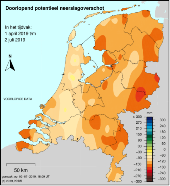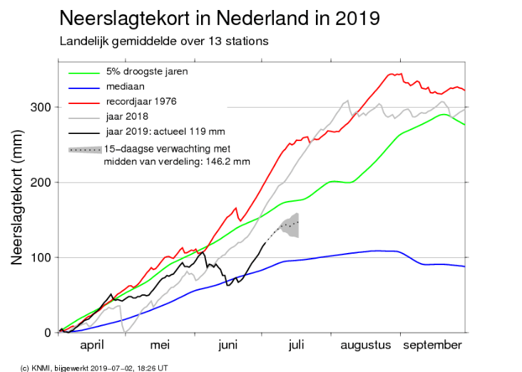 Op veel plaatsen in ons land hebben we een neerslagtekort. Dit is volstrekt normaal voor deze tijd van het jaar, want in de zomer verdampt er eenmaal meer dan er valt. In het westen van het land is in sommige gebieden het neerslagtekort ongeveer 30 millimeter, maar in het oosten van het land zijn sommige regio's hard op weg om een neerslagtekort van 250 millimeter te kunnen noteren. Voor die regio is die droogte vergelijkbaar met dezelfde periode een jaar geleden op veel plaatsen in ons land.