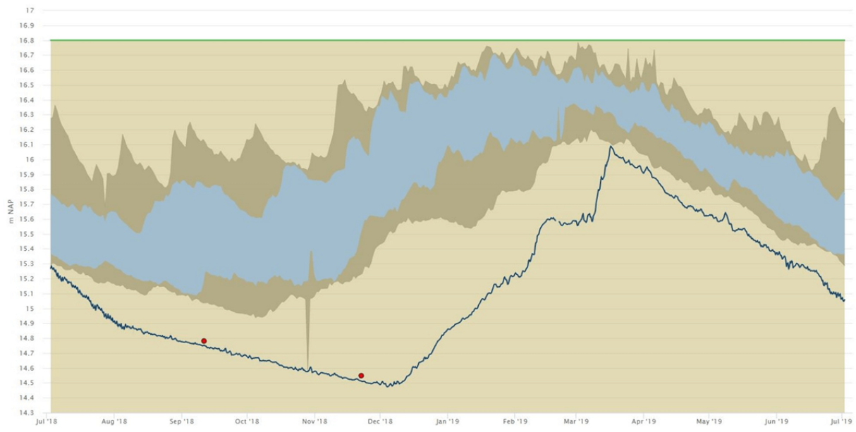 Grondwaterpeil in de buurt van Zelhelm. Dit peil ligt nu lager dan vorig jaar deze tijd. Van herstel is daar na de droogte van 2018 nog nooit sprake geweest (bron: WeerPlaza)