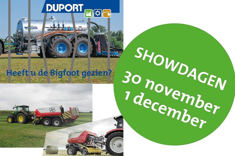 Op vrijdag 30 november en zaterdag 1 december houdt Duport uit Dedemsvaart haar jaarlijkse showdagen. De imposante Duport Bigfoot pomptankwagen en de nieuwe Pöttinger persen zijn onder andere de blikvangers.