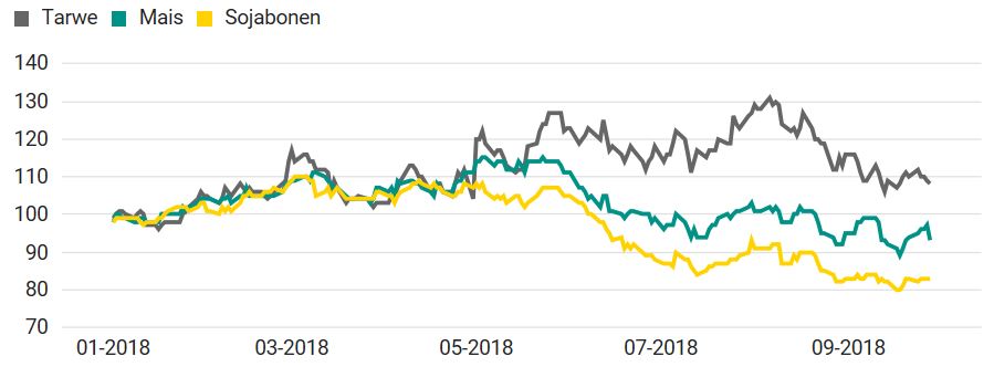 De prijstrends van agrarische grondstoffen laten in 2018 een divers beeld zien. De prijzen van maïs en sojabonen hebben flink terrein verloren. Het economisch beleid van de VS – de combinatie van handelspolitiek en monetair beleid – en de onzekerheid die daaruit voortvloeit, heeft de druk op de prijzen opgevoerd. De spotprijs van tarwe staat echter eind september 13% hoger dan op 1 januari 2018. Dit komt vooral door de extreme droogte in met name Noord-Europa van juni tot augustus. Ook bij de tropische grondstoffen is een tweedeling te zien.