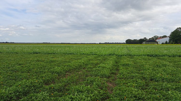 Om met de demo ook kennis op te doen over het effect van verschillende meststoffen en biostimulanten, zijn dwars over de demo drie banen bespoten met BlueN (0,333 gram per hectare), N-xt (25 liter per hectare) en Status (0,25 liter per hectare). Lopend over het perceel zijn de effecten op het blote oog niet te zien. Een dronevlucht met infraroodcamera zal binnenkort meer informatie geven over eventuele verschillen in bladmassa.