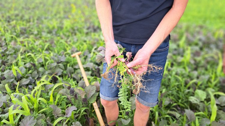 Het Terralife Nfixx 50-mengsel is ook een vorstgevoelig soortenrijk en bloemrijk mengsel. Het bevat diverse vlinderbloemigen, wat zorgt voor stikstofbinding. Het heeft een positief effect op de bodemstructuur dankzij onder andere de sorghum en de facelia. Van der Heide haalt een sorghumplant uit de grond en laat de wortels zien. “Sorghum heeft een speciale wortel die extra diep de grond in gaat”, wijst hij. Daarmee maakt hij de weg in de bodem extra open voor het volggewas. Sorghum bevordert bovendien de vorming van mycorrhiza.”