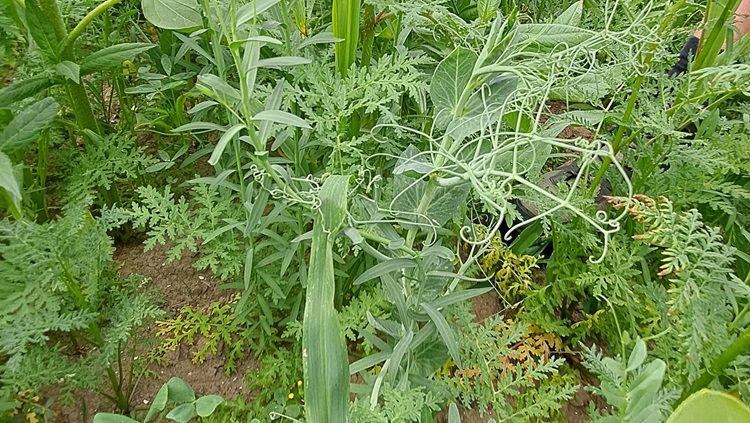 Mooi is de samenwerking tussen planten in een mengsel te zien. De erwten gebruiken een andere plant om tegenop te klimmen.