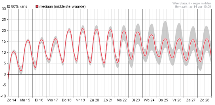 Grafiek 1: De weerpluim geeft met Pasen warm weer aan. Echter volgende week wordt de wisselvalligheid wel wat groter. (Bron: WeerPlaza)