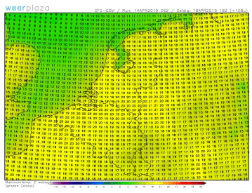 Afbeelding 2: Donderdag wordt waarschijnlijk een warme dag met temperaturen >20 graden. (Bron: WeerPlaza)