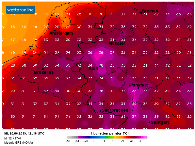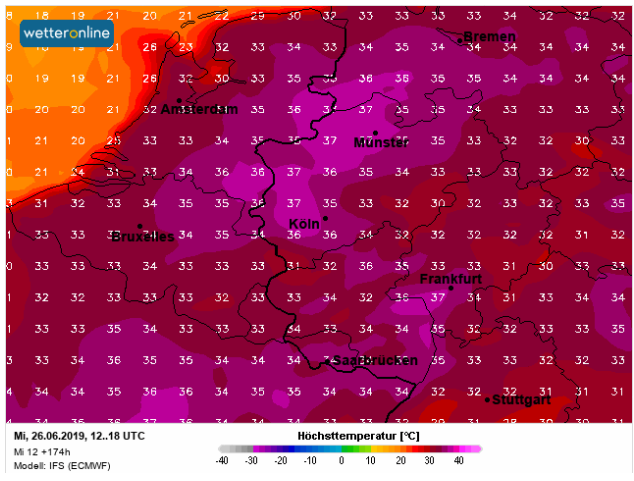 Of het all-time warmterecord er aan gaat is nog maar zeer de vraag. Ooit werd er op een officieel meetstation van het KNMI 38,6 graden gemeten. In Warnsveld werd deze waarde op 23 augustus 1944 afgelezen door waarnemer Jan Thate. De weerkaarten lijken nu nog niet zo ver te willen gaan, maar we hebben natuurlijk nog een paar dagen te gaan en we sluiten niets uit, aldus WeerPlaza.