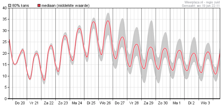 Hierboven staan twee temperatuurkaarten voor woensdagmiddag 26 juni a.s. De eerste is het Europese model, de onderste die van Amerika. Dit is slechts een enkele uitvoer. Het is echter meer aan te raden om naar de pluim te kijken die het Europse model weergeeft (zie hieronder). Hier zien we een rode lijn die de gemiddelde waarde aangeeft van alle uitkomsten op dat moment. Met de grijze zone wordt de marga aangegeven waarin de uitkomsten zitten. (bron WeerPlaza).