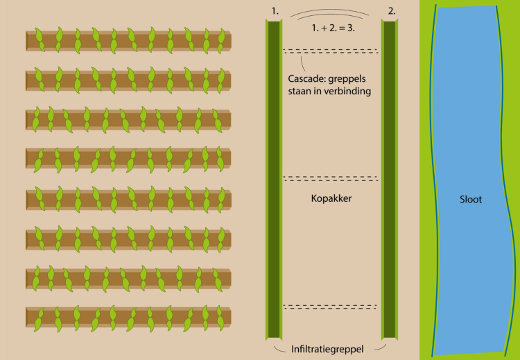 Schematische weergave van (de locatie van een aantal) infiltratiegreppels; één van de maatregelen om emissie van gewasbeschermingsmaatregelen vanaf het perceel te verminderen.