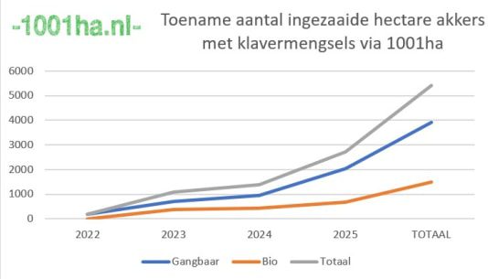 In 2025 hebben akkerbouwers 3.440 hectare ingezaaid met klaveronderzaai of groenbemestermengsels via de campagne 1001ha. Hiermee droegen zij bij aan een gezondere bodem, meer biodiversiteit, minder stikstofuitspoeling en schoner water. Uit enquête onder de deelnemers aan de groenbemestersactie blijkt dat zij 36% kunstmest reduceerden bij de vervolgteelt. In de akkerbouw kunnen klavers dus een grote bijdrage leveren aan de verduurzaming van de landbouw.