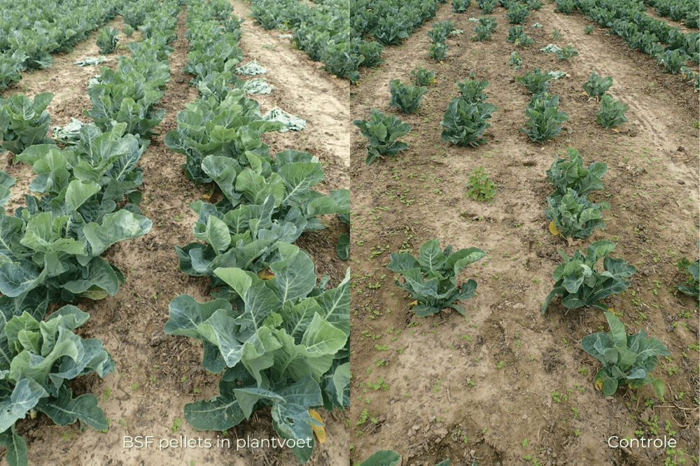 Die inzichten werden verder getoetst in veldproeven. In de aardappelteelt testte Inagro frass als gedeeltelijke of volledige vervanger van kunstmest. Percelen met hoge frassgiften startten trager, maar groeiden later in het seizoen gelijk op met de kunstmestcontrole. De uiteindelijke opbrengst was vergelijkbaar, met in sommige gevallen zelfs grotere knollen. Ook in wintertarwe bleken dosering en timing bepalend: hoge concentraties frass konden groeiremmend werken, terwijl lagere dosissen positieve effecten op de plantgezondheid lieten zien. In bloemkool zagen we in proeven over meerdere jaren een hogere plantweerbaarheid tegen insectenschade.