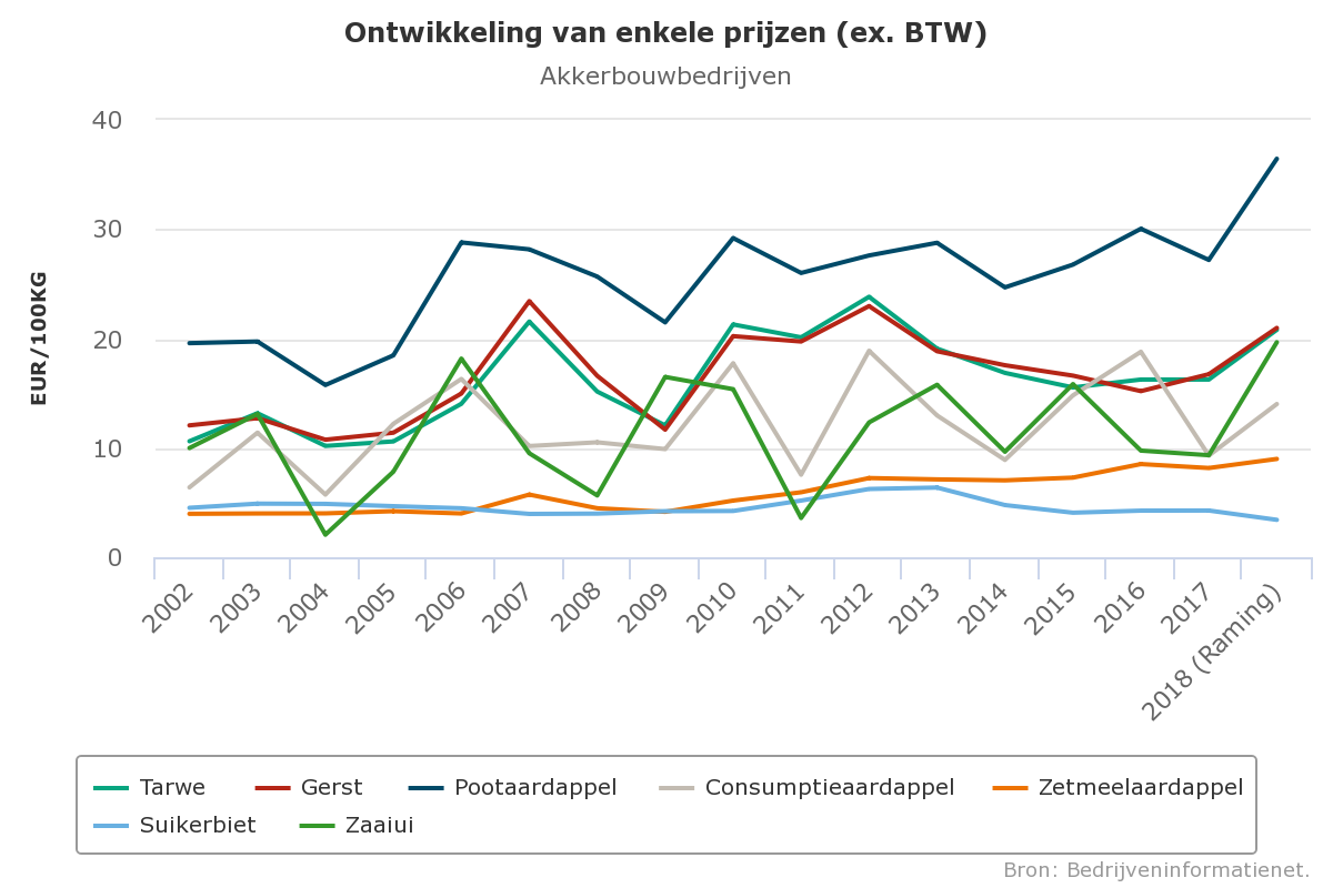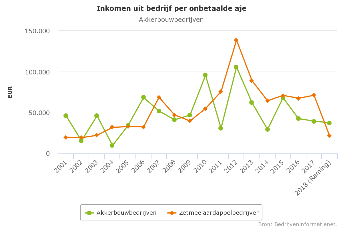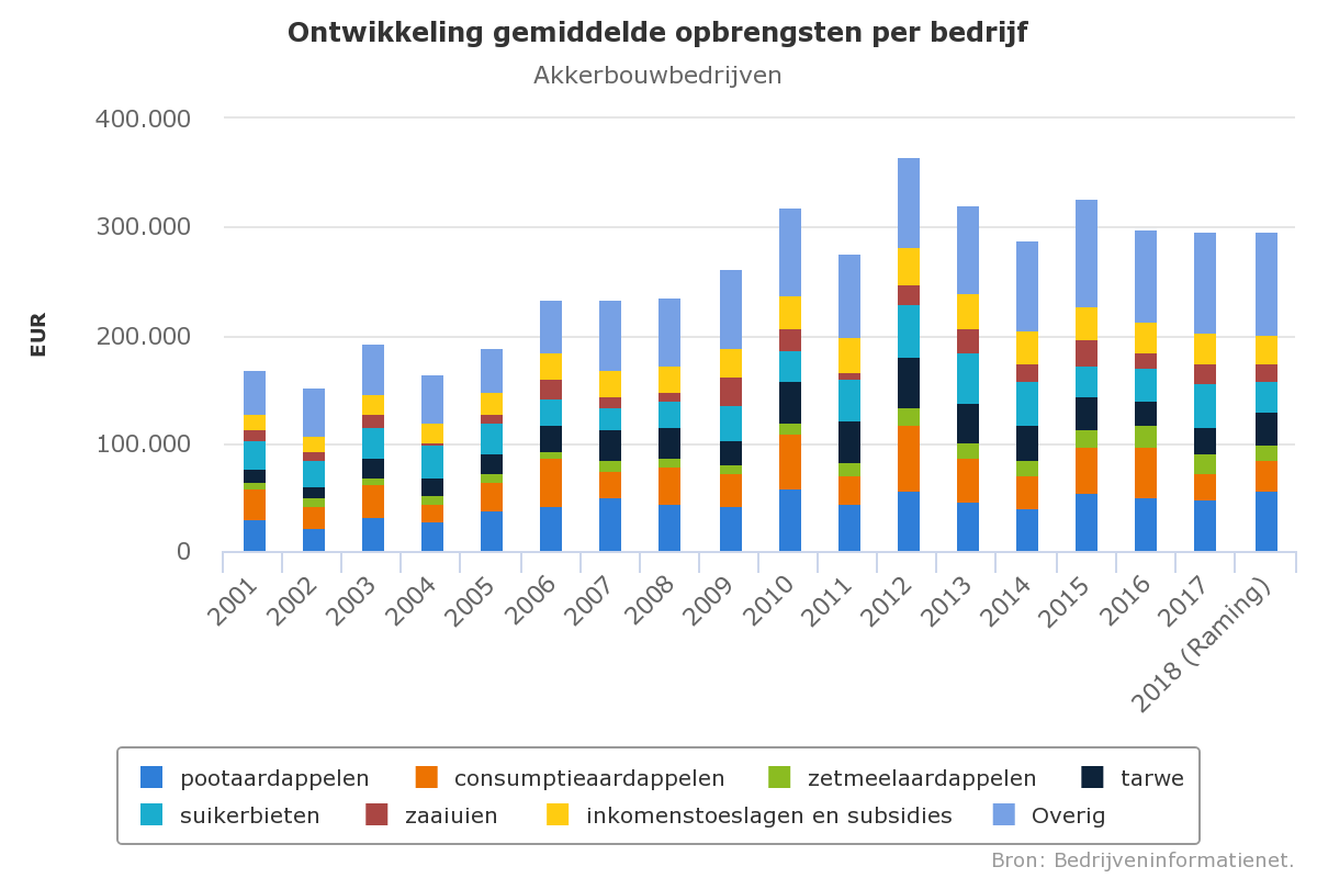 Voor het oogstjaar 2018 wordt een gemiddeld inkomen geraamd van bijna 40.000 euro per onbetaalde arbeidsjaareenheid. De regionale verschillen en de verschillen tussen bedrijven zijn echter groot. In het Zuidwestelijk kleigebied kon er veelal niet beregend worden en zal er naar verwachting gemiddeld nauwelijks een positief inkomen worden gerealiseerd.